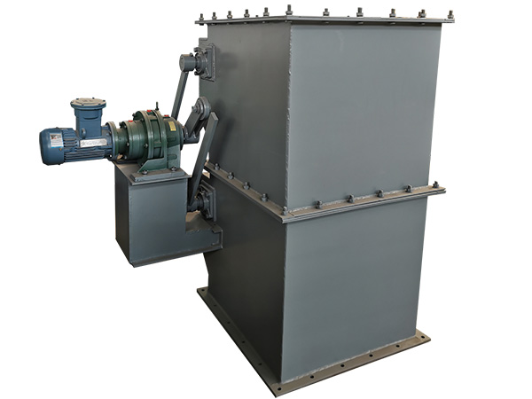 由减速器带动传动杆通过曲柄、凸轮及连杆分别带动上、下两传动轴旋转,交互开启,通过配备的杠杆系统或拉伸弹簧,阀板可靠的复位,防止野风吹入,以确定的开闭频率完成系统的给卸料。